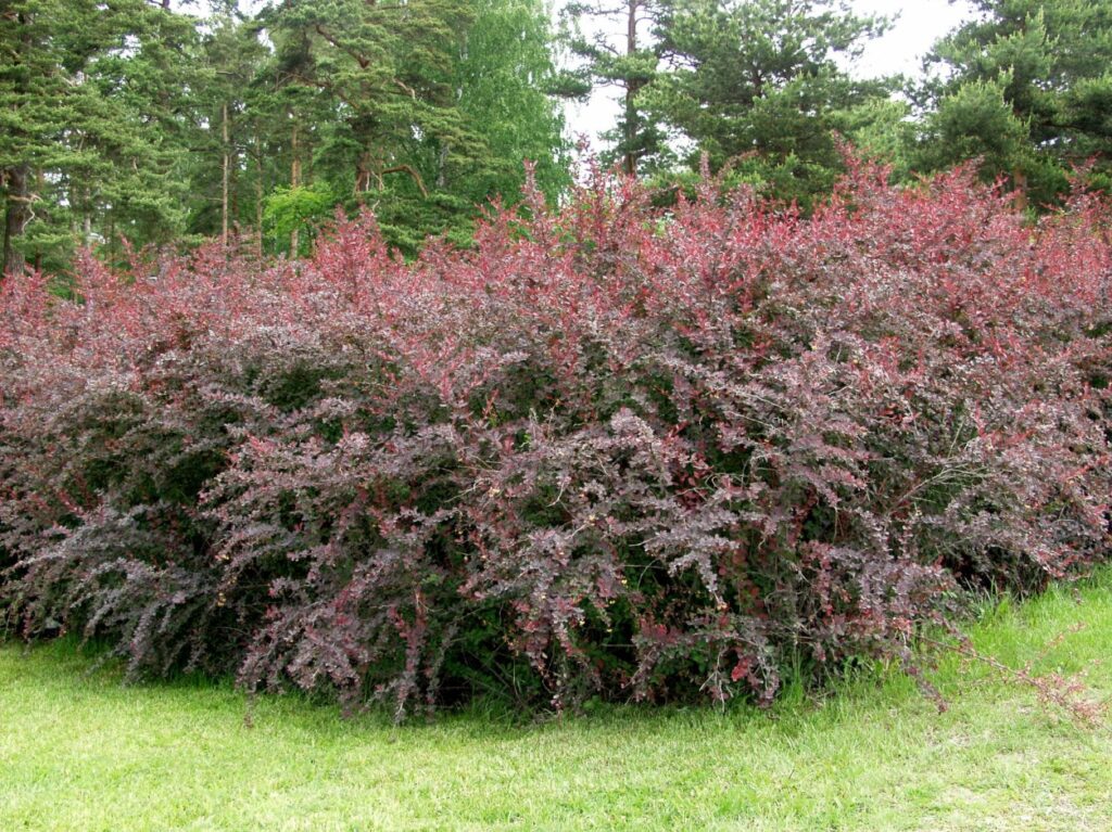 Барбарис «Оттавский Суперба» — это канадский сорт, который отличается крупными размерами, достигая в высоту и ширину 3-4 метра. Кора у этого кустарника красно-коричневая, а листья блестящие, темно-красные или пурпурные, что делает его декоративным на протяжении всего сезона. Осенью листва становится оранжевой или бледно-красной. В мае кустарник цветет желто-красными кистевидными соцветиями с приятным сладковатым ароматом.