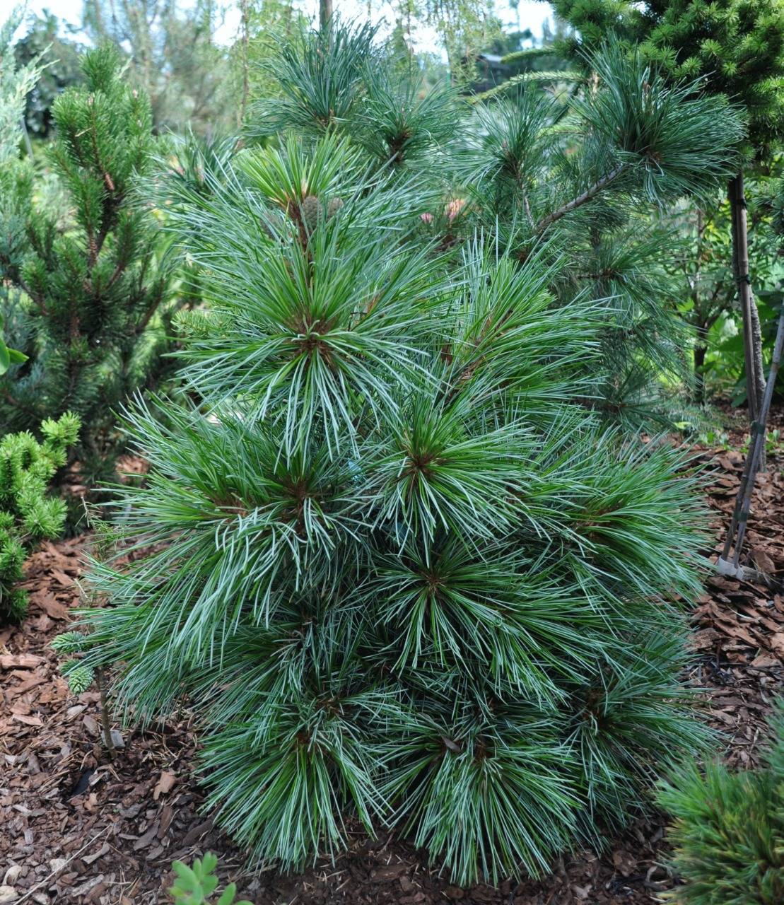 Предлагаемый саженец кедра корейского, высотой от 20 до 40 см, отличается внушительной и плотной кроной. У молодых деревьев форма кроны бывает округло-яйцевидной, тогда как у зрелых экземпляров она принимает цилиндрическую или коническую форму. С возрастом у кедра могут появляться несколько вершин, что связано с естественными процессами старения дерева, стремлением к увеличению площади питания и максимизации производства шишек. Иногда вершины могут обламываться из-за тяжести шишек, что приводит к росту новых, или же их повреждают медведи, пытаясь добраться до шишек.