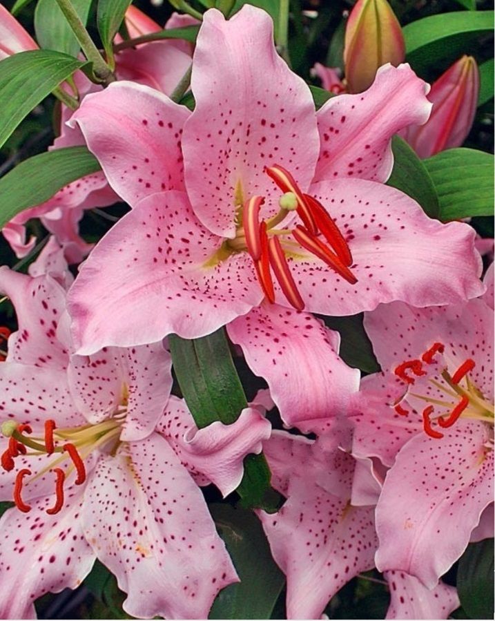 - Зимовка: Восточные гибриды лилий должны зимовать в сухой почве. Для этого с середины сентября грядки накрывают пленкой, а после начала подмерзания почвы пленку снимают и посадки засыпают хвойным опадом, листвой или сухим торфом. Можно также натягивать пленку на дугах над посадками для продления вегетационного периода.