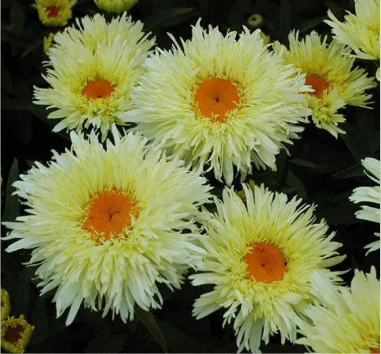Цветение Голдрауша обильное и продолжается с конца июня до августа. Цветы крупные, диаметром около 10 см, с одиночными корзинками. Лепестки узкие, загнутые в разные стороны и бахромчатые, бело-кремового цвета, с лимонно-желтыми центрами. Махровость цветков придает этому сорту особую эффектность.