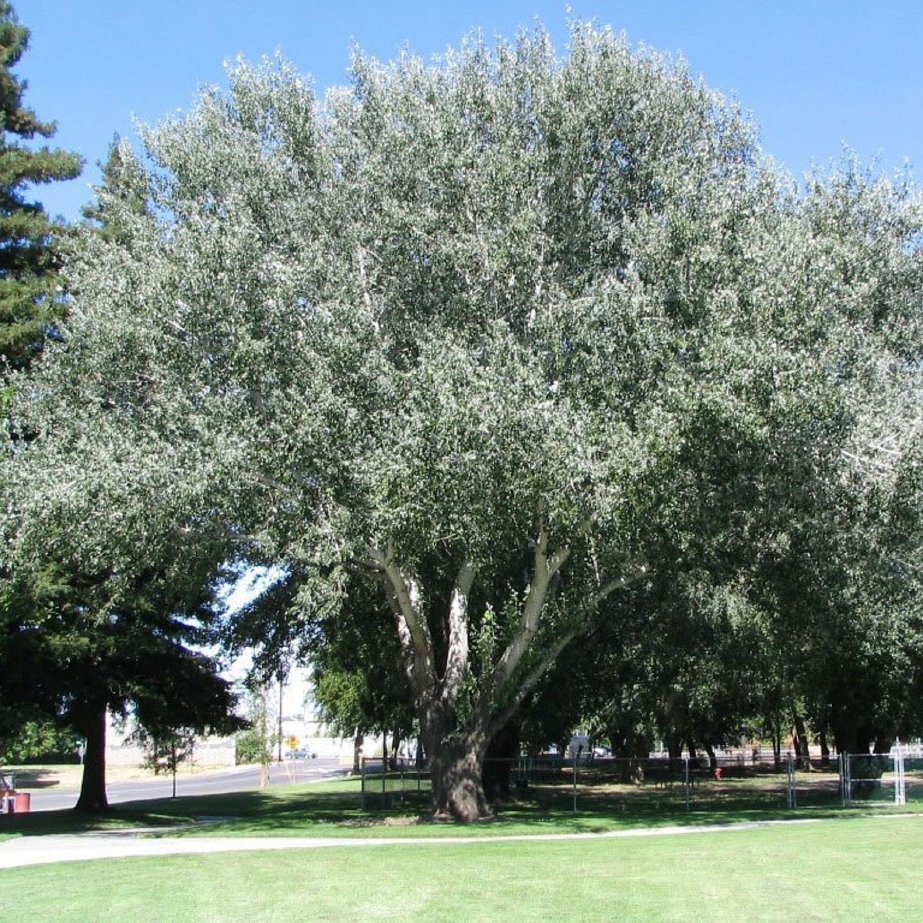 Несмотря на то, что тополь часто ассоциируется с надоедливым пухом, существуют сорта, которые не производят пуха, и Серебристый тополь — один из них. Это дерево достигает высоты до 30 метров и обладает широкой раскидистой кроной. Кора у молодых деревьев серо-зеленая и гладкая, с возрастом она покрывается глубокими трещинами. Молодые побеги имеют бело-войлочное опушение. Листья плотные, от овальных до пальчато-лопастных, с крупными зубцами, сверху темно-зеленые и блестящие, а снизу бело-войлочные. Осенью листья приобретают лимонно-желтый оттенок, что придает дереву дополнительную декоративность.